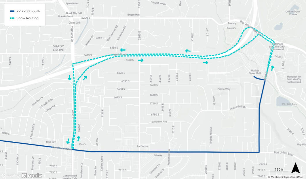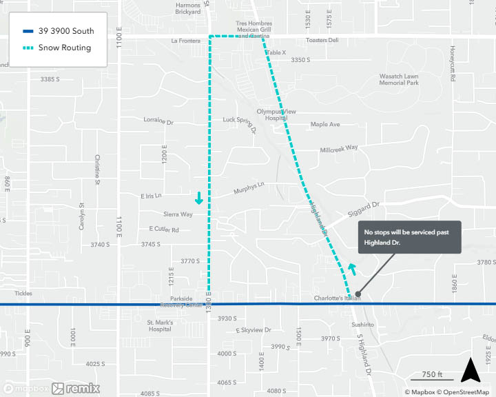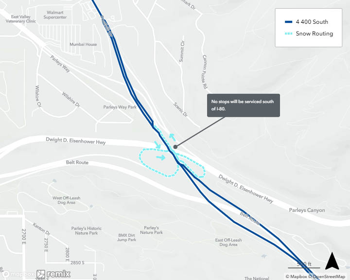 When a bus is on snow routing, it will detour from its regular route. You may need to catch your bus at a different location during this time. See below to find your route’s specific snow routing map to determine where to catch the bus. If you need assistance, please call 801-743-3882 or contact us on Twitter at @RideUTA or sign up to receive route-specific notifications.